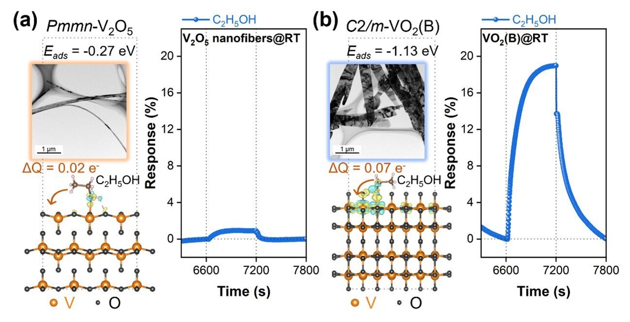 To better understand the synthesized VO2(B) material’s excellent selectivity, the team used density functional theory (DFT) calculations. These calculations revealed for the first time that the unique surface structure of VO2(B) strongly adsorbs ethanol molecules and promotes efficient charge transfer. This helped them clarify the mechanism responsible for the enhanced sensing performance.