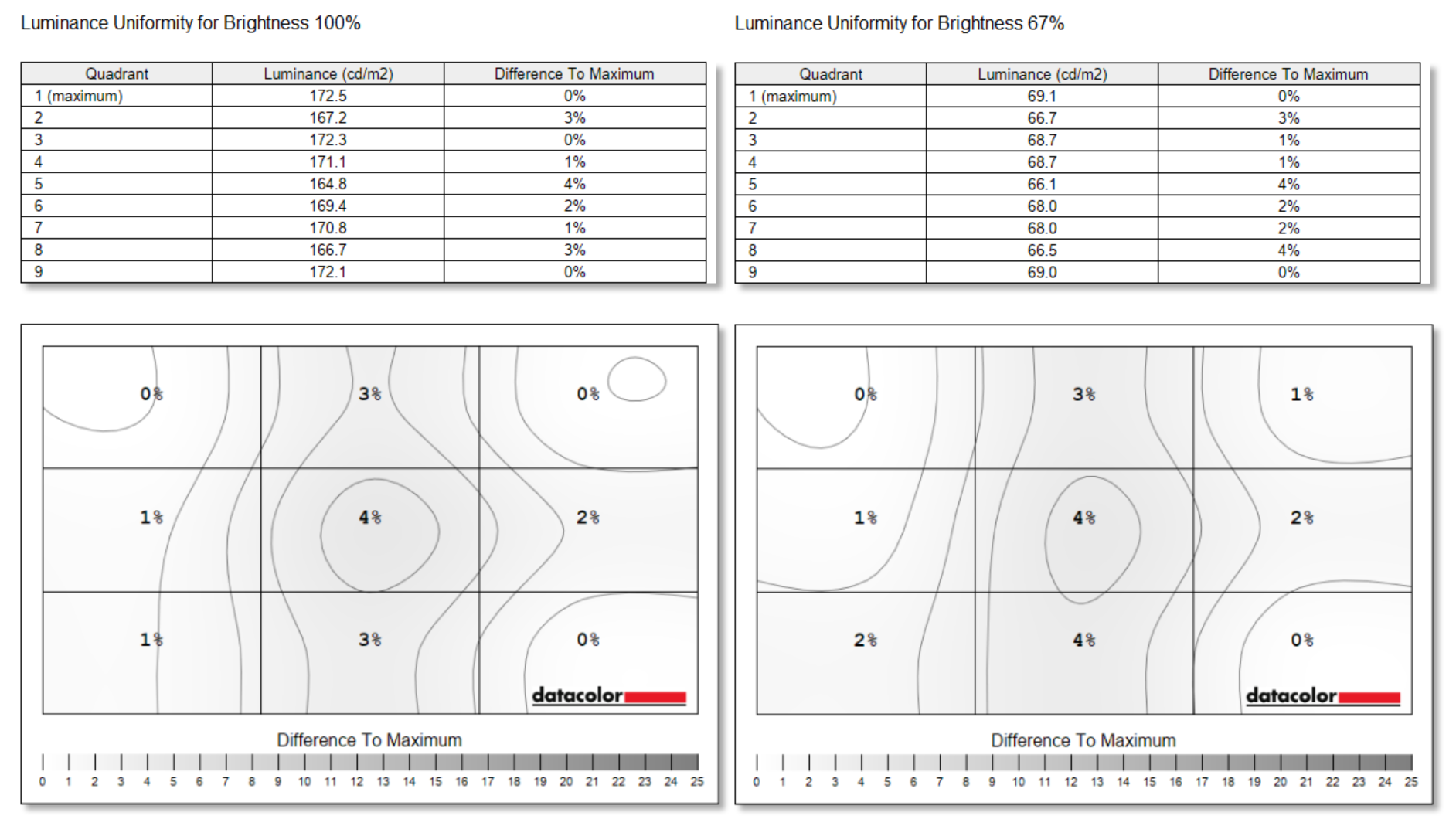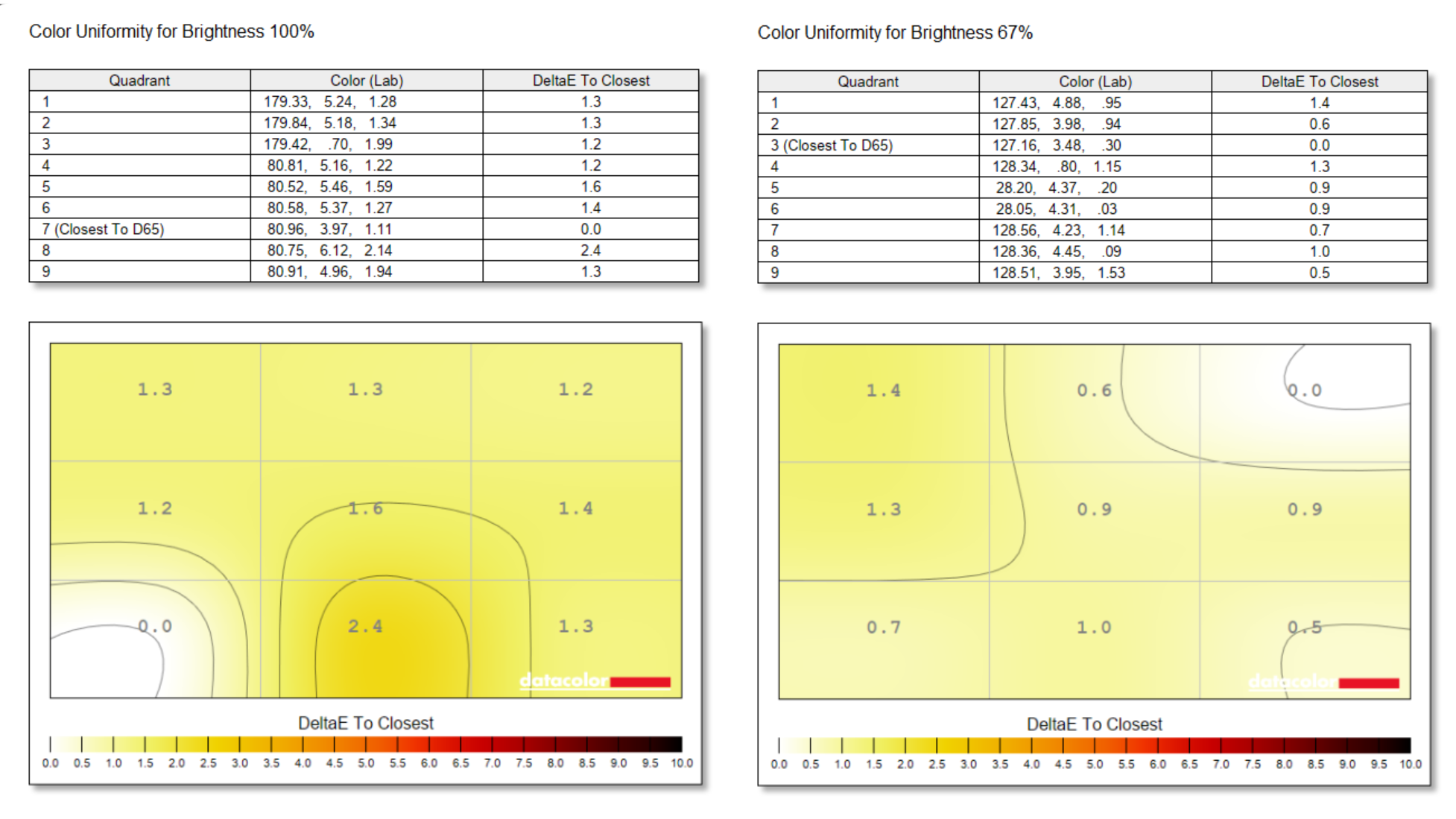 Color uniformity isn’t quite so great, with a difference between the most and least accurate screen regions of Delta E 2.4, but it’s by no means a bad performance. What’s more, reduce brightness down to a more usable 67% and color uniformity improves considerably, to a deviance of just Delta E 1.4.