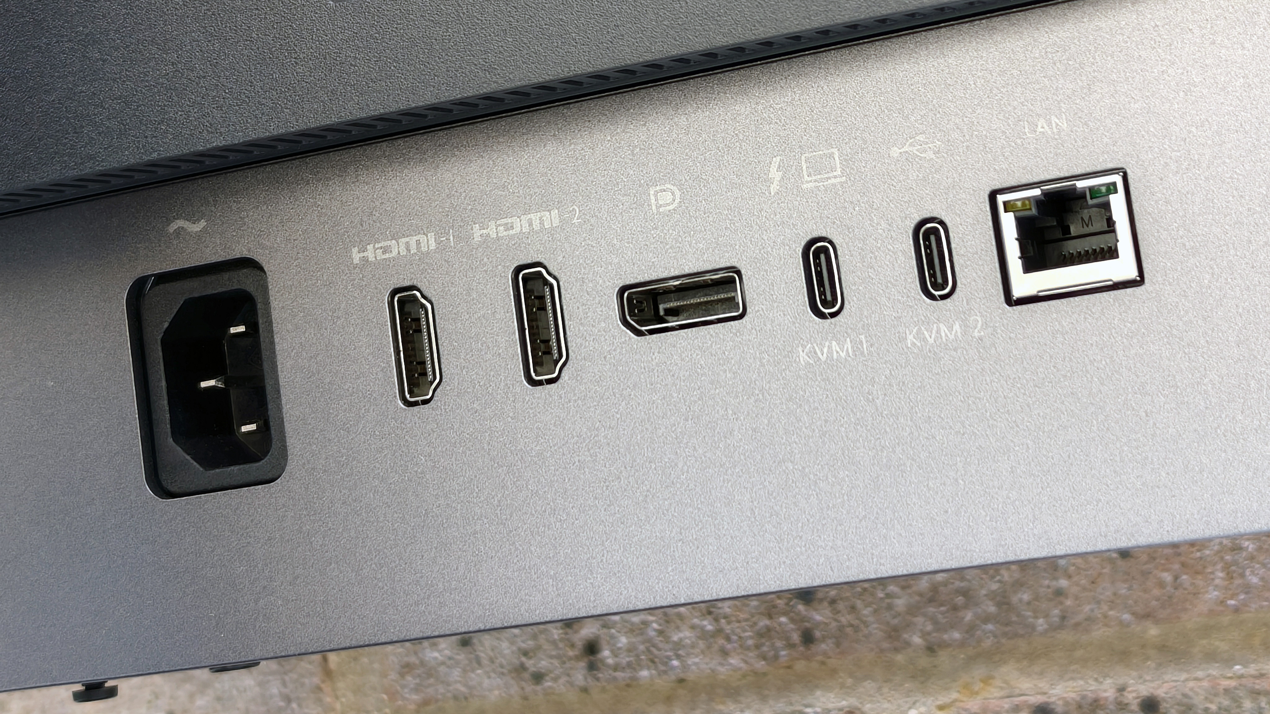 At the rear of the panel are fairly standard input sockets, including a pair of HDMI ports, a single DisplayPort connection, dual USB-C ports, and an RJ45 LAN connection which is used for network-managed firmware updates and synchronized color management. If you connect a laptop via USB-C, the monitor can supply it with up to 96W of power, so you can have a single cable carrying power and video data.