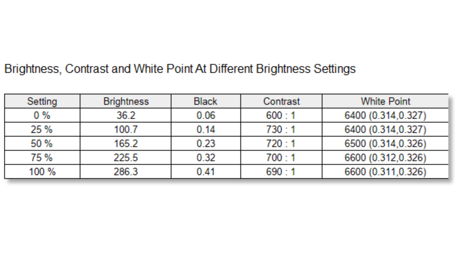 If you choose to enable the screen’s brightness uniformity mode, maximum brightness is reduced to 286.3 nits. This does appear noticeably dimmer to the naked eye, though again, it’s still well above the brightness level you’ll likely be editing at.