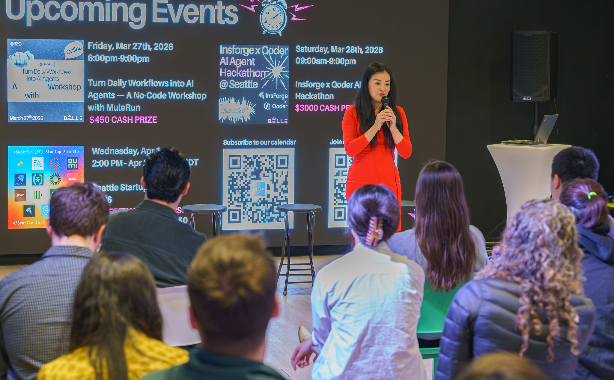 A panel of venture capitalists — Brooke Borseth from FUSE, Nate Bek from Ascend, and Hang Huang from InsForge — offered feedback on the pitches. Ke Du, a senior product manager at Apple and VP of programs at B.E.L.L.E, led the Q&A session.