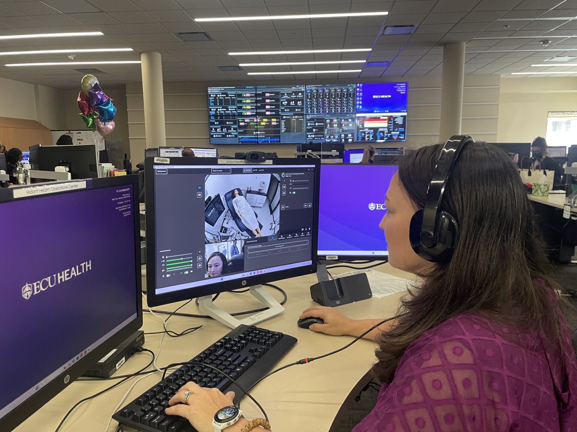 Inside ECU Health Medical Center, a centralized operations hub coordinates care for patients across multiple hospitals in the region. Through video technology, critical care doctors can connect instantly with patients, nurses, and families.
