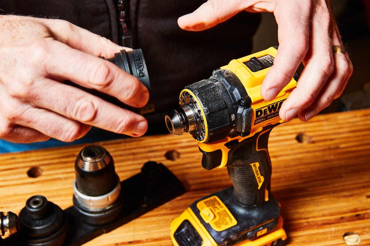 DeWalt’s latest drill/driver is like an “all in one” multitool for the cordless platform in that it can accomplish a lot of different tasks in one convenient package. Straight out of the box, the drill has the same feel as DeWalt’s standard drill or impact driver, except the drive head is broken down and exposed to the gearing mechanism. Accompanying the body of the drill is a solid plastic rack with 4 drive heads nested in a row.