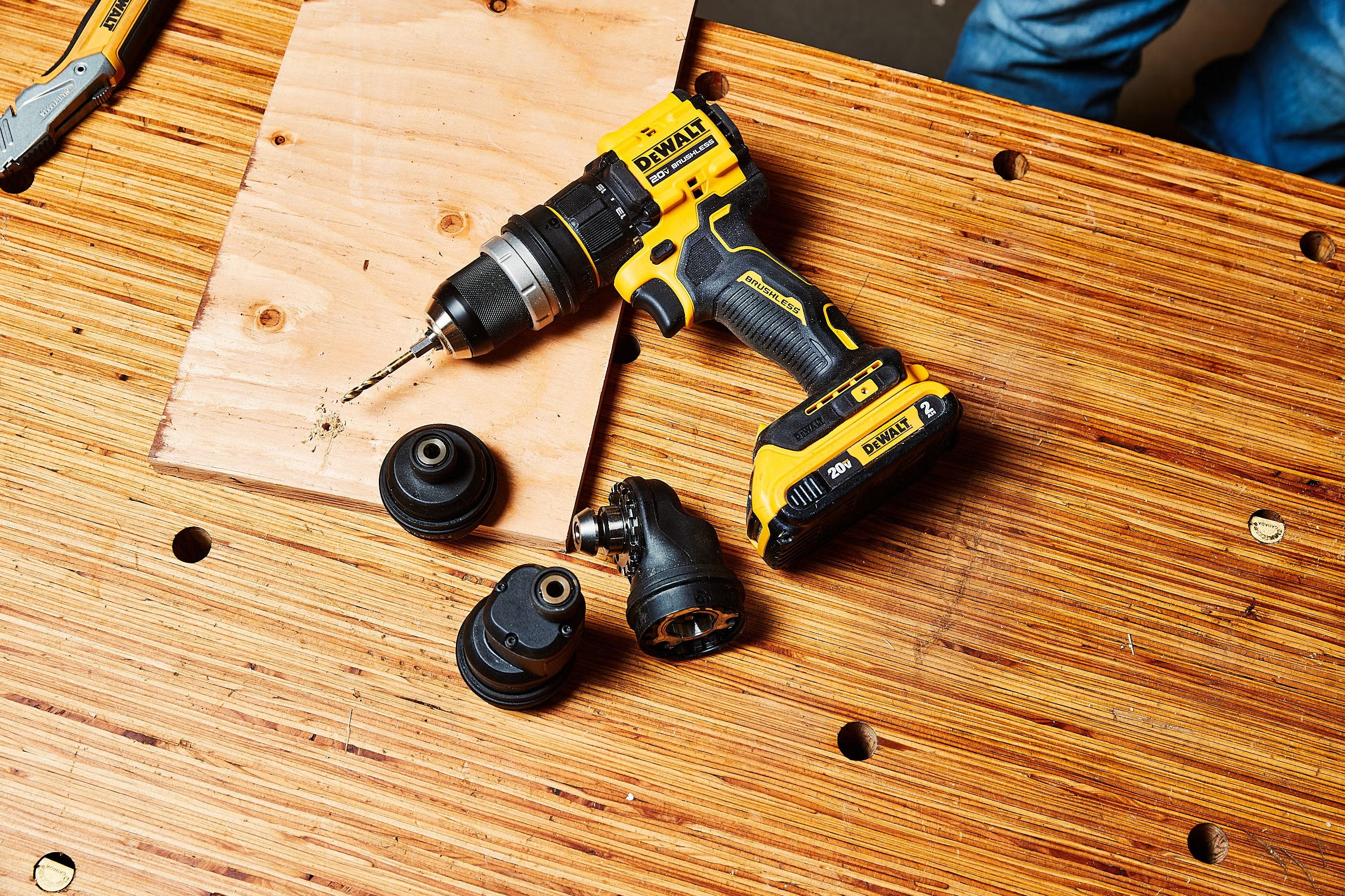 DeWalt’s latest drill/driver is like an “all in one” multitool for the cordless platform in that it can accomplish a lot of different tasks in one convenient package. Straight out of the box, the drill has the same feel as DeWalt’s standard drill or impact driver, except the drive head is broken down and exposed to the gearing mechanism. Accompanying the body of the drill is a solid plastic rack with 4 drive heads nested in a row.