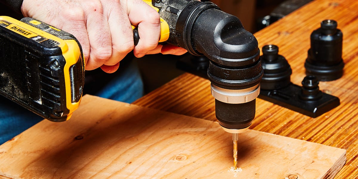 And best of all, the user can lock in the right-angle attachment at multiple positions relative to the drill body itself. This puts the trigger control in a postion that best suits the user. Where my brother’s project was concerned, the ability to manipulate the tool to fit the space was remarkable.